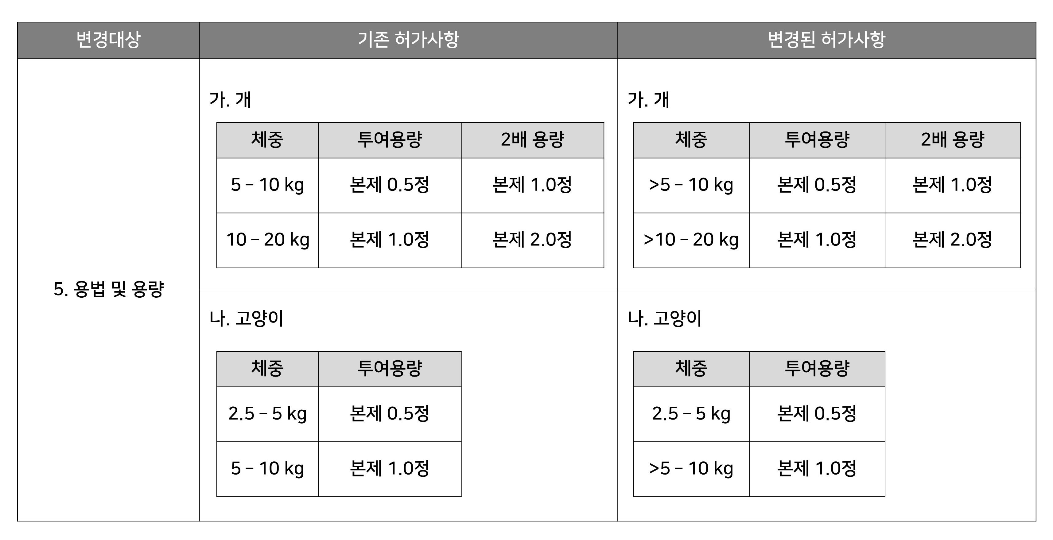 [허가사항 변경 전, 후 비교표]